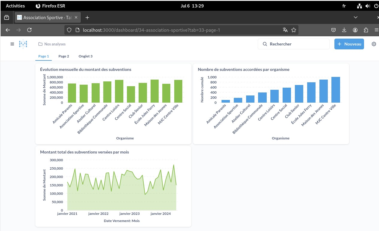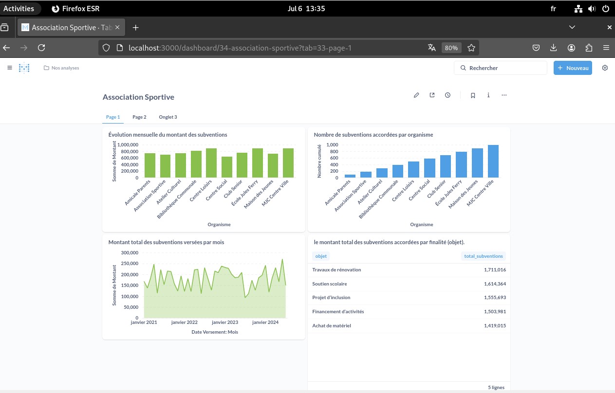 Dans Metabase, je tippe correctement les colonnes (date, nombre), je crée des “Questions” (séries temporelles, top N, répartitions) puis je les assemble en Dashboard (évolution mensuelle, top organismes, total par finalité).